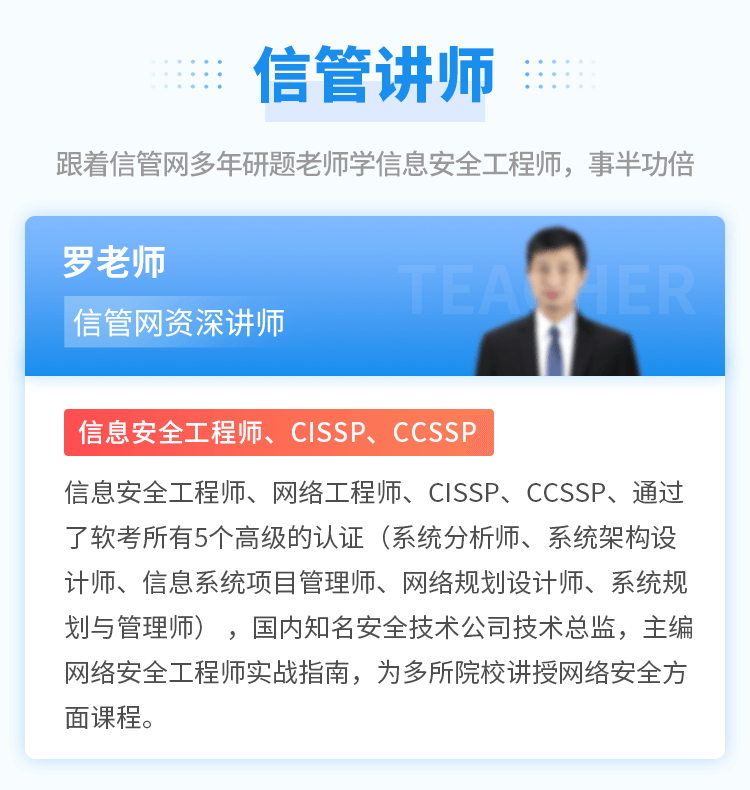 當前位置:信管網(wǎng) >> 信息安全工程師視頻培訓(xùn)課程 >> 信息安全工程師精講視頻班